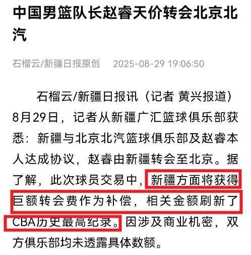 新疆媒体新疆日报不久前发文,主要是介绍赵睿转会北京队的情况。其中转会费也有提及,是这么说的,此次球员交易中,新疆队获得巨额转会费作为补偿,相关金额刷新了CBA历史最高纪录。因为商业机密,双方俱乐部并未公开金额。